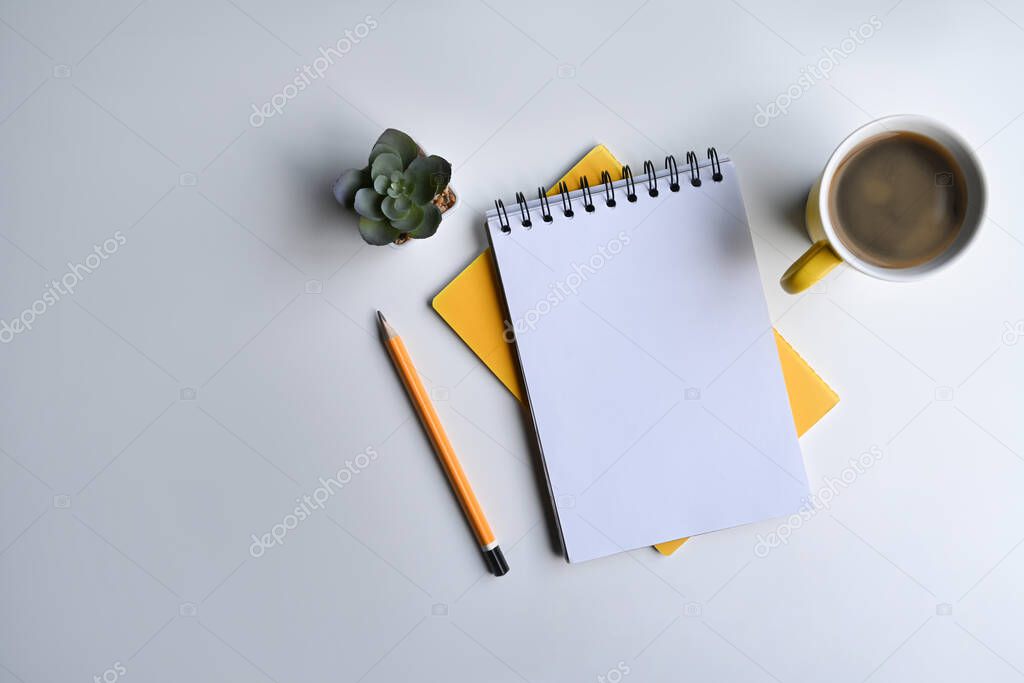 - Notebook, coffee cup, pencil and succulent plant on white table. Flat lay.