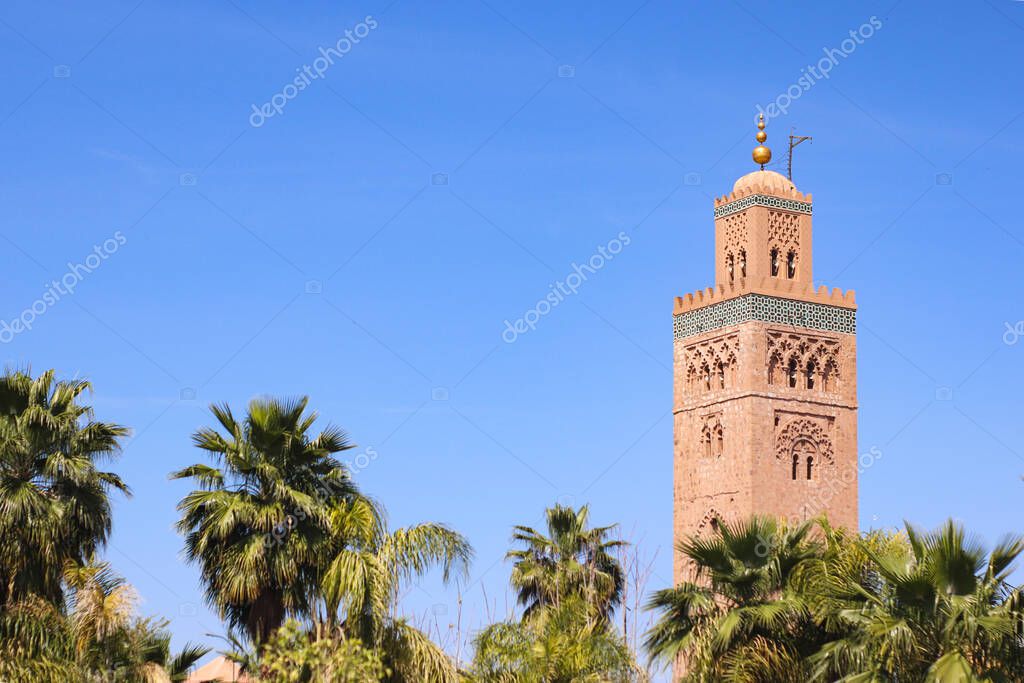 - Minaret of Koutoubia mosque on blue sky background in Marrakech, Morocco
