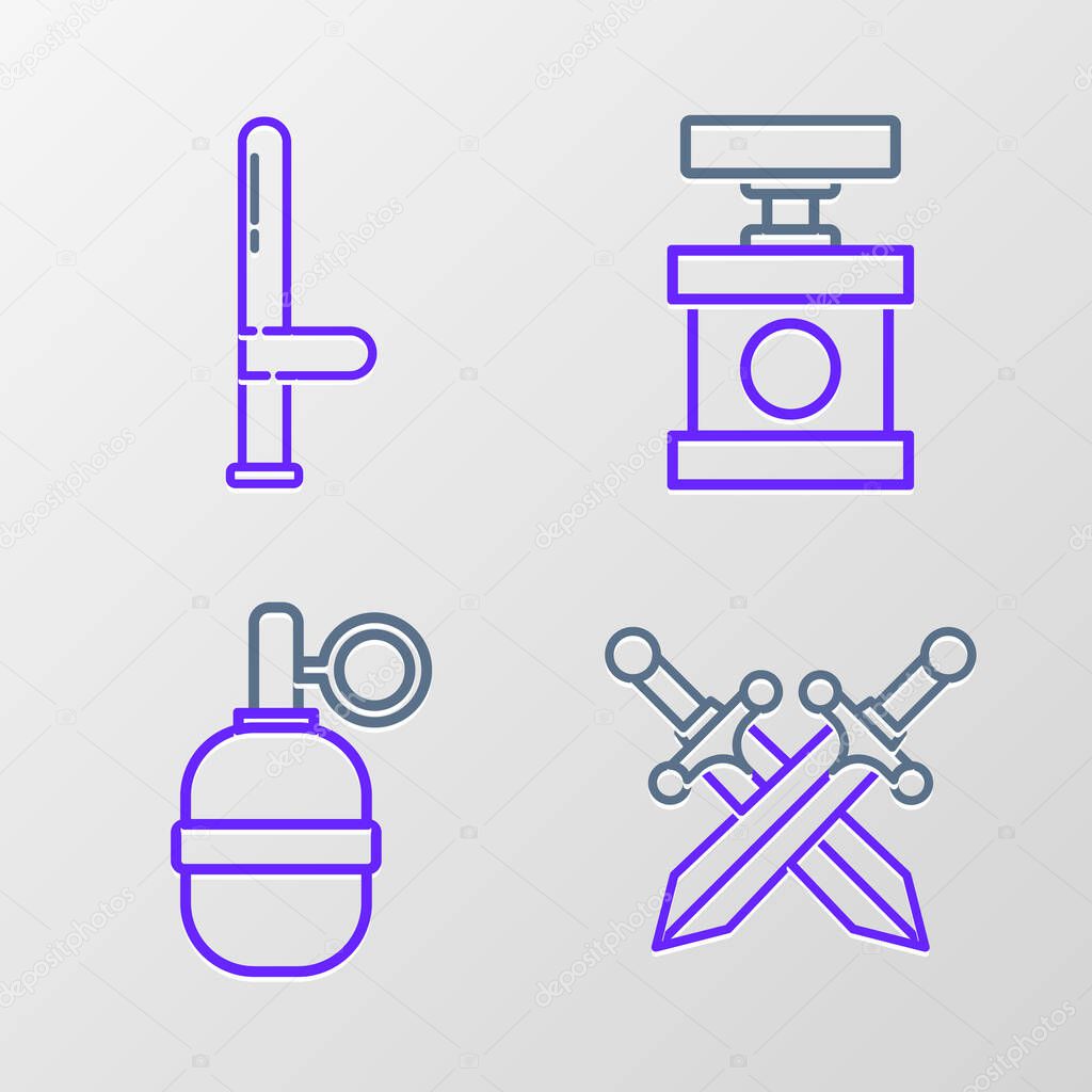 - Set line Crossed medieval sword, Hand grenade, Handle detonator for dynamite and Police rubber baton icon. Vector