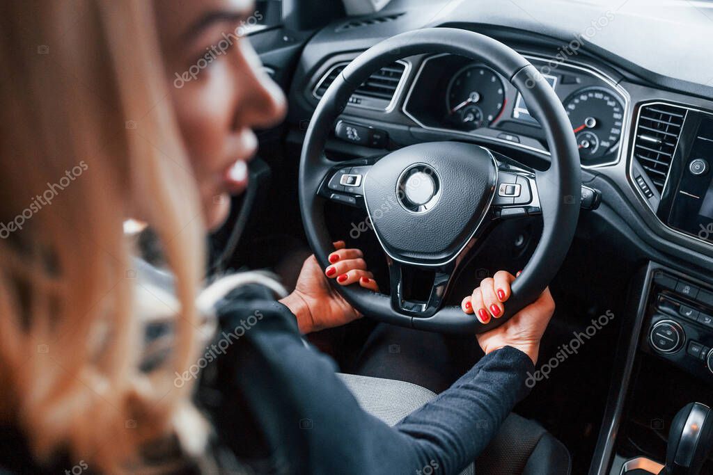 Rear view of beautiful blonde in elegant clothes that sitting inside of modern car.