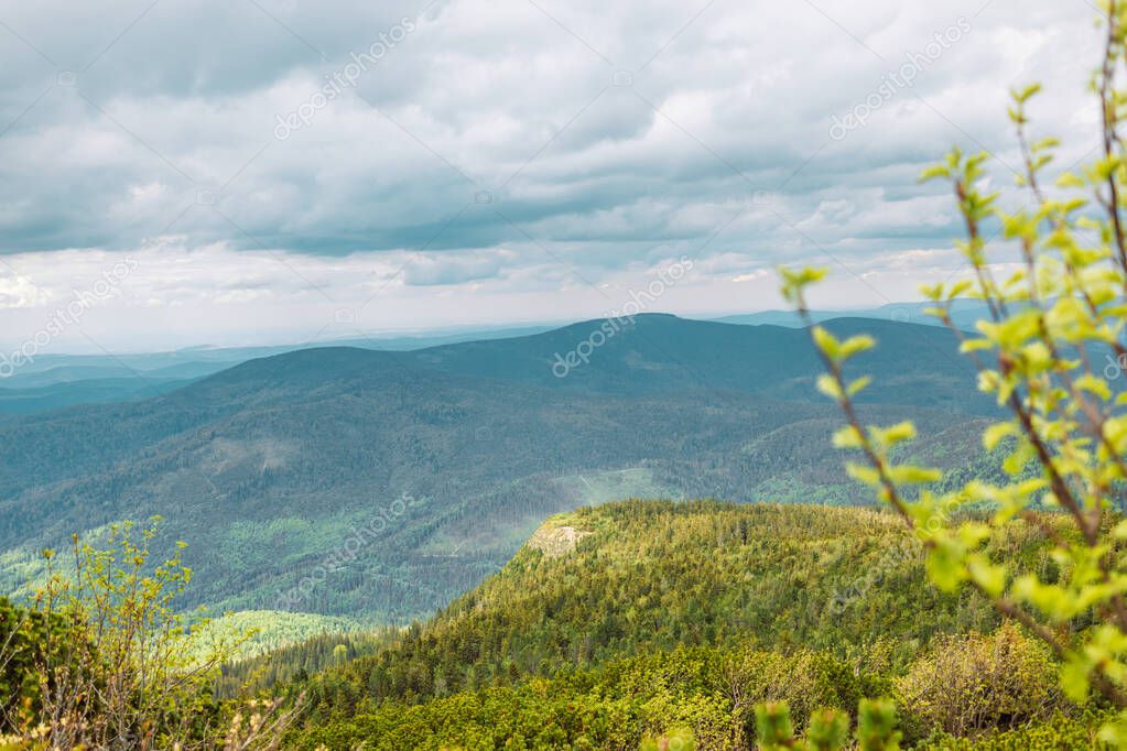 - Amazing mountain landscape with nature plants on the cloudy sky, natural outdoor travel background. Beauty world.