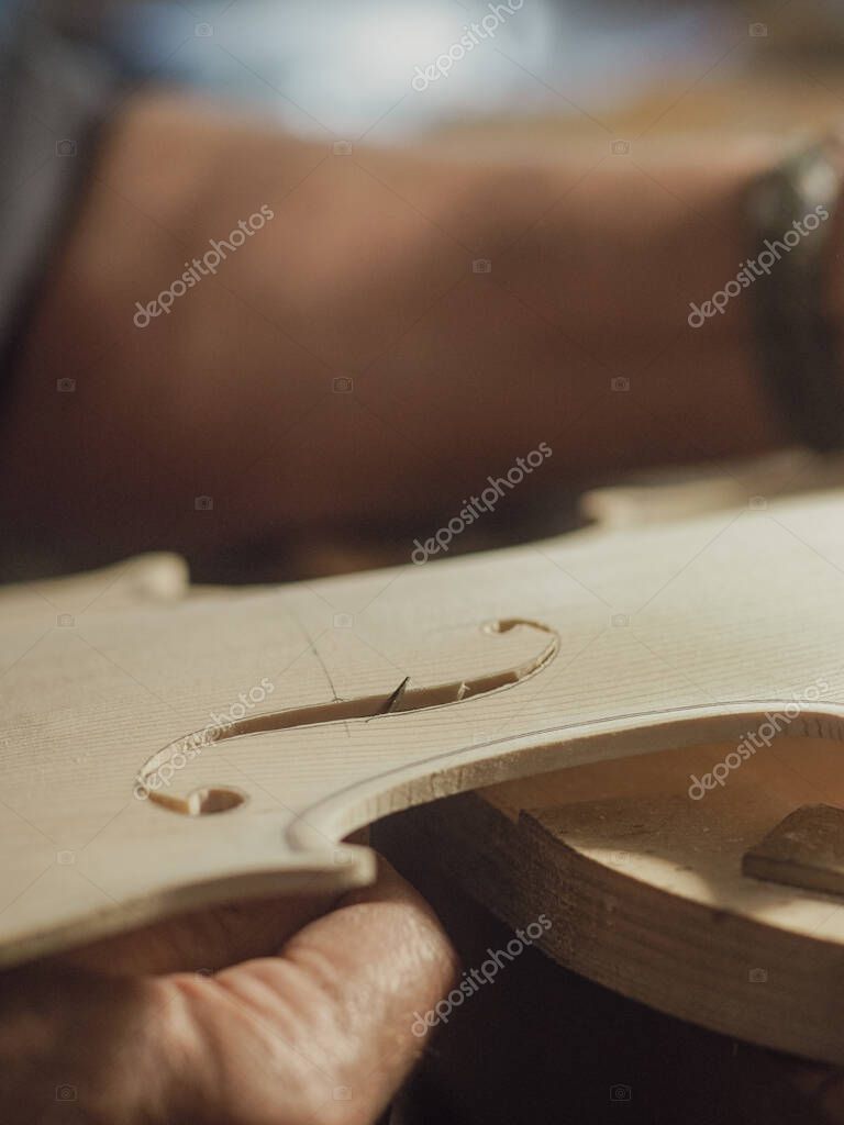 - violinmaker cutting and sawing cremonese violin model fholes with a blade with precision