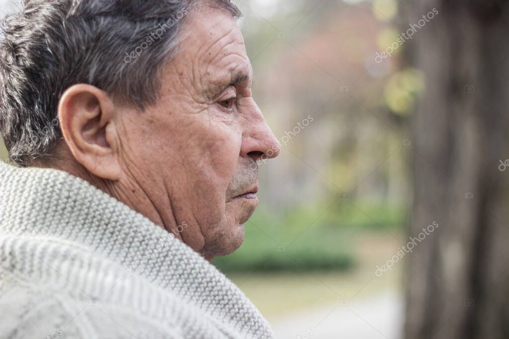 - Old man relaxing outdoors and looking down. Portrait of senior man looking thoughtful