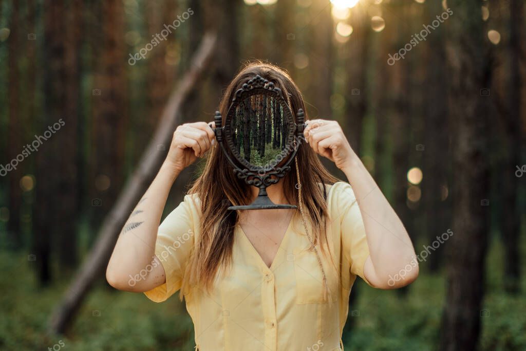 - Woman with mirror instead of face on the forest background. Mindfulness, Mind and soul, Mental health, wellbeing, wellness, world mental health day concept.