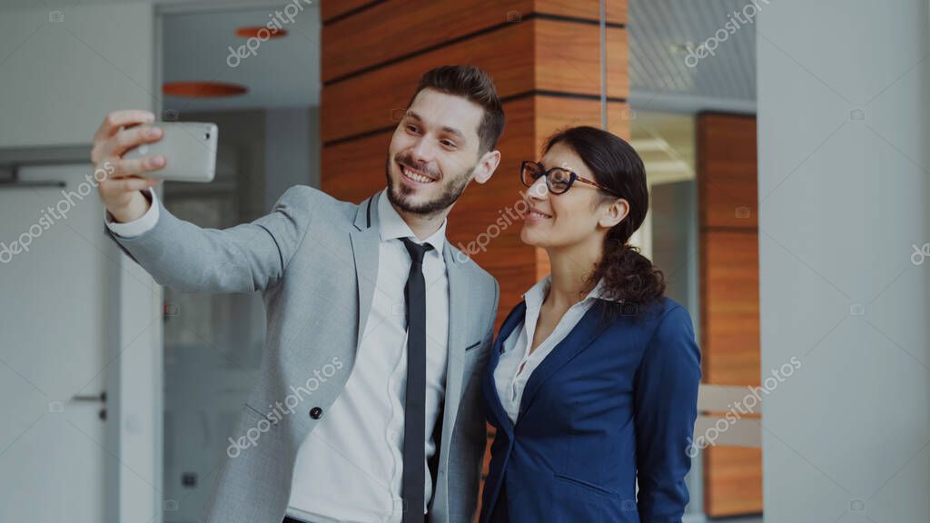 - Happy businessman and his female colleague taking a selfie on smarphone camera for social media in modern office indoors