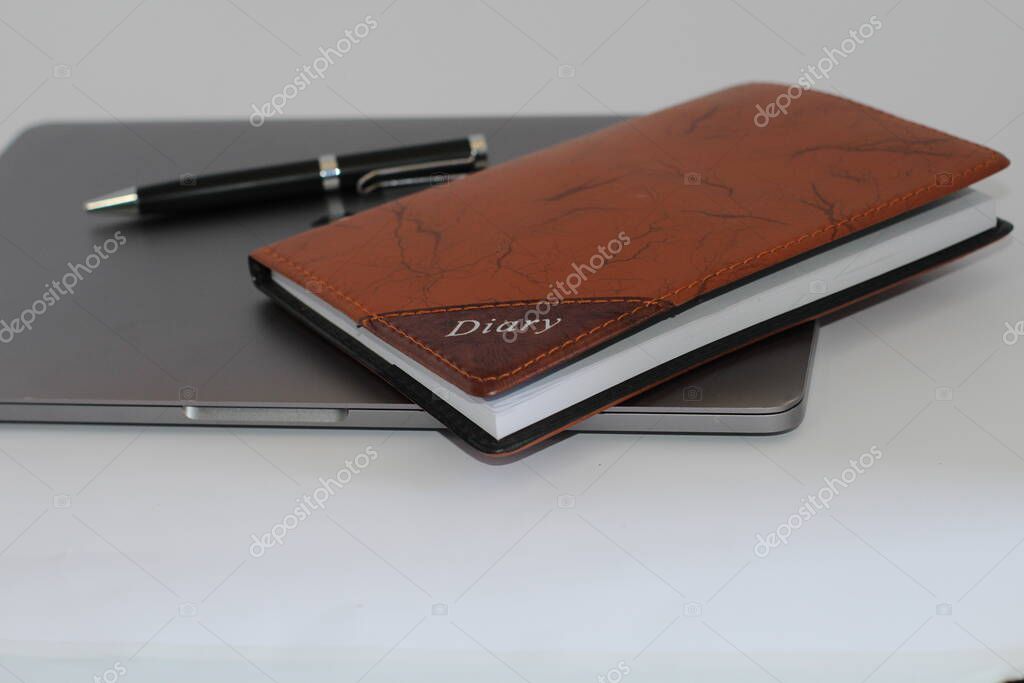 - Macbook pro with pen and diary on white background