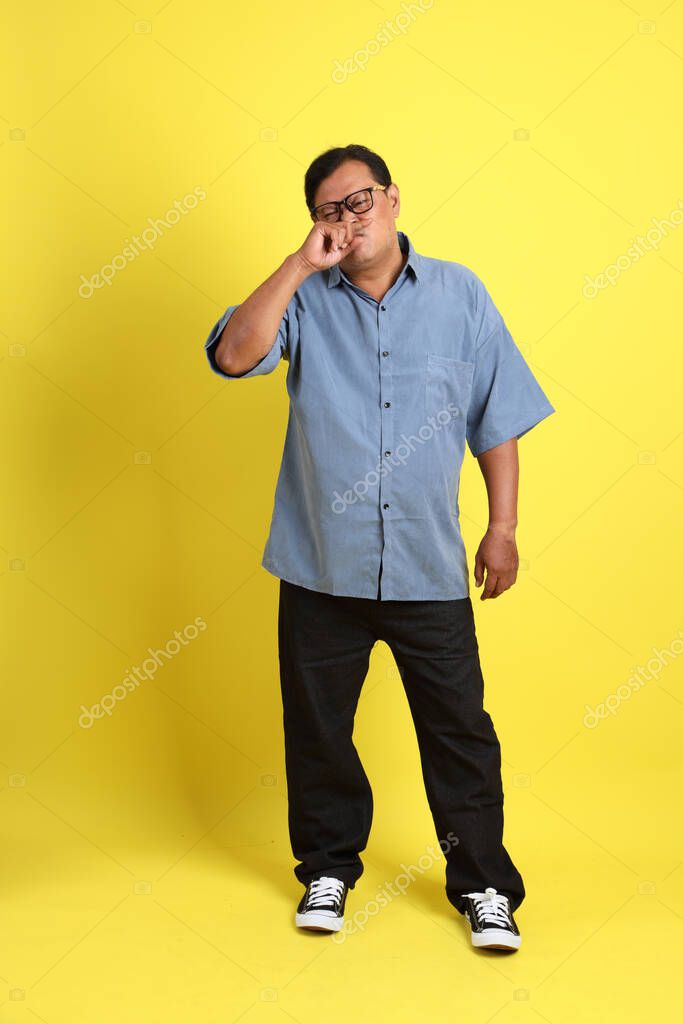 The adult Asian man with blue shirt standing on the yellow background.