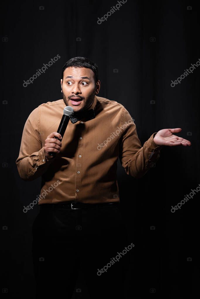 Emotional indian comedian in shirt and bow tie holding microphone and gesturing during monologue on black