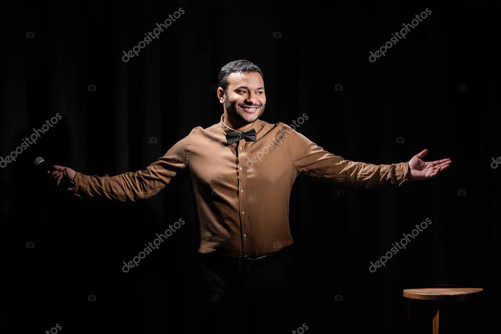FUN ENTERTAINMENT EVENT HAPPY SMILING ADULT CHEERFUL MAN BLACK COMIC EMOTION HOLD TALK MIC MICROPHONE PERFORMANCE STAGE JOYFUL CULTURE EASTERN HUMOR MEDIA ENTERTAINER EXPRESSIVE HANDSOME PERFORMER POSITIVE PLEASED GESTURE SPEAK INDIAN COMEDY ACTOR BEARDED COMEDIAN JOKING MONOLOGUE SHOWMAN JOKES COPY SPACE ONE PERSON STUDIO SHOT MIDDLE EAST BOW TIE STAND UP DRAMATIC LIGHTING OUTSTRETCHED HANDS
