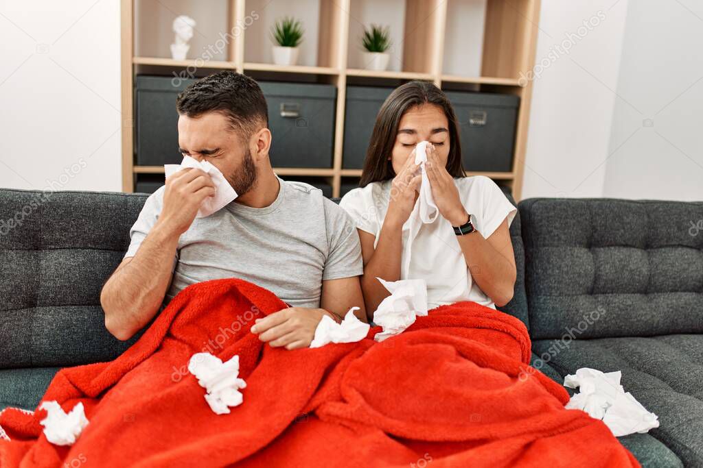- Young latin ill couple using napkin sititng on the sofa at home.