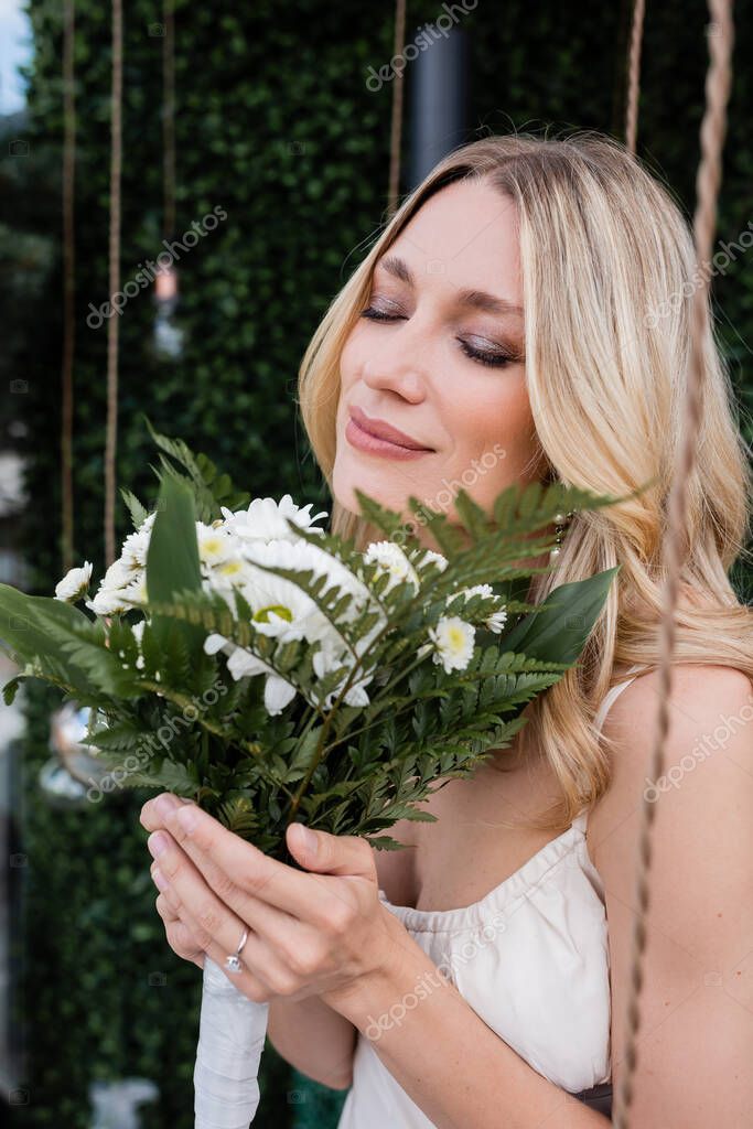 - Blonde bride with closed eyes smelling bouquet on terrace