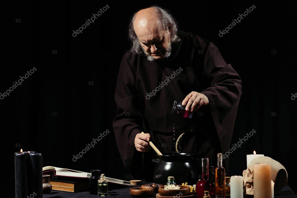 - medieval alchemist preparing magic potion while adding ingredient into pot isolated on black