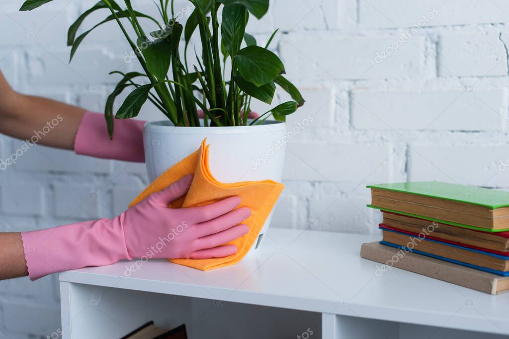 Cropped view of woman in rubber gloves wiping flowerpot near books
