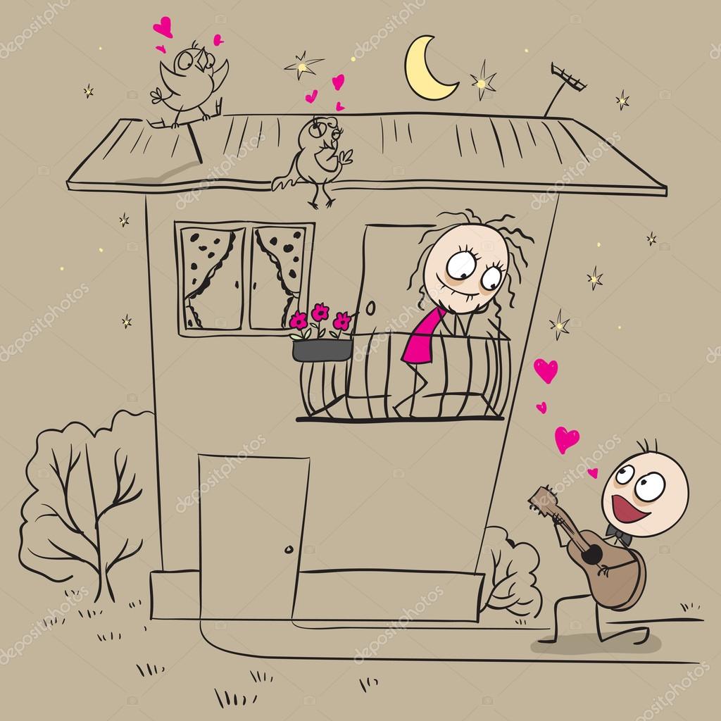 Guy plays guitar and sings a serenade his girlfriend. Vector cartoon illustration