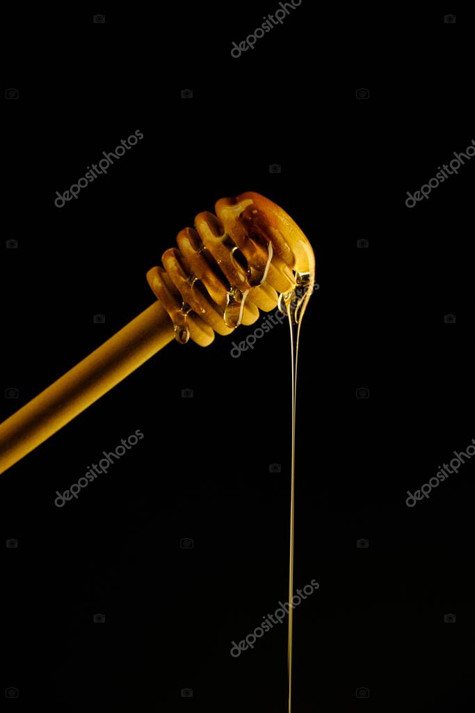 - Wooden spoon for honey on black background and liquid fresh honey flowing down it