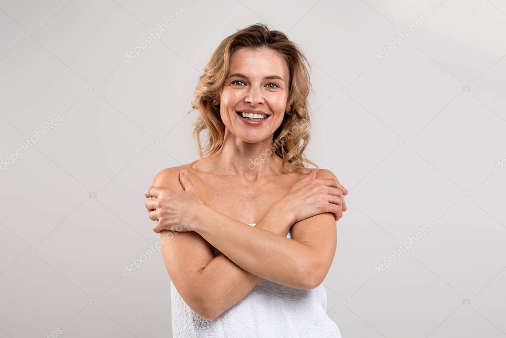 - Enjoying Beauty. Happy Attractive Middle Aged Lady Wrapped In Bath Towel Embracing Herself, Beautiful Cheerful Female Smiling At Camera While Posing Over Light Grey Studio Background, Copy Space
