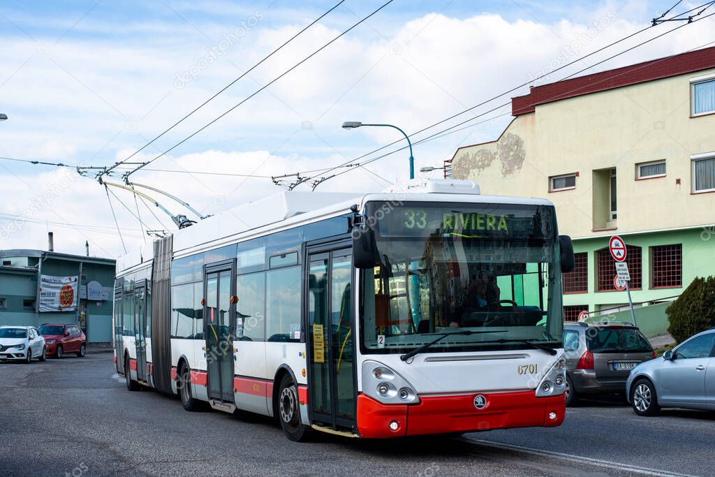 BRATISLAVA, SLOVAKIA - MARCH 08, 2022. Trolleybus Skoda 25Tr Irisbus #6701 riding with passengers in the streets of Bratislava.