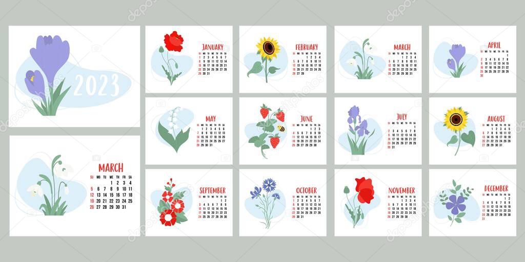 Floral calendar 2023. Flowers snowdrops, lily of the valley, poppy, sunflower, irises, crocuses and mallows. Horizontal template 12 pages and cover in English. Vector illustration. Week from Sunday