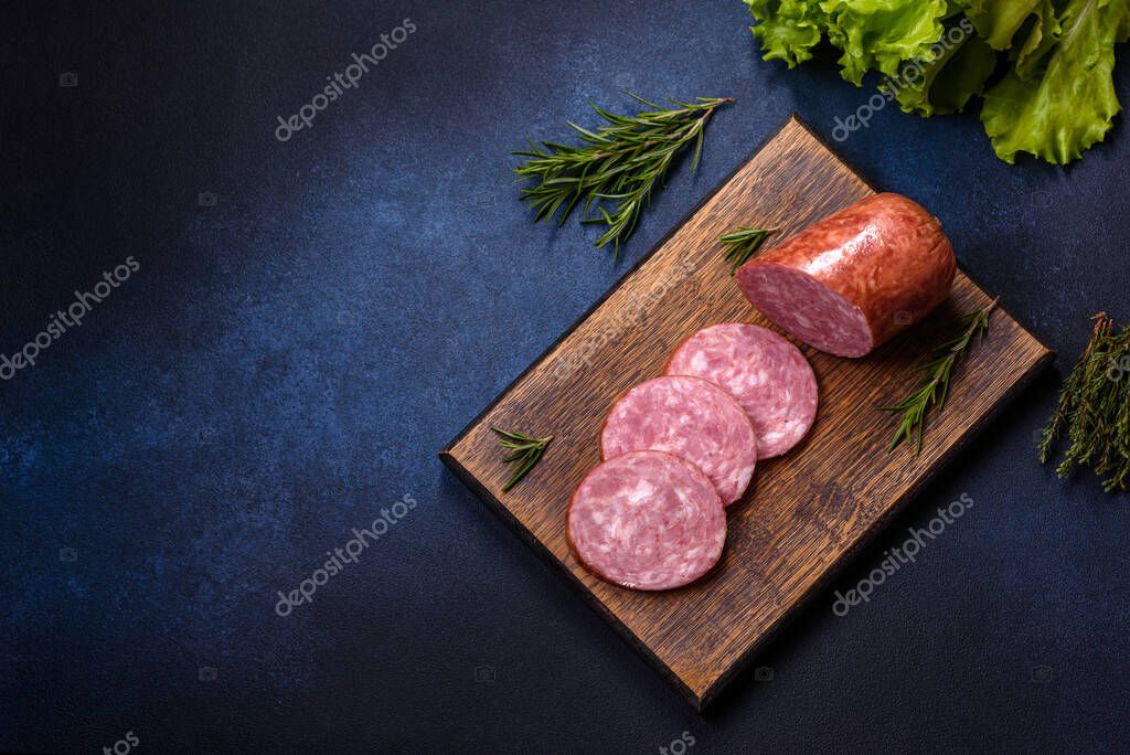 - Delicious fresh smoked sausage cut with slices on a wooden cutting board against a dark concrete background
