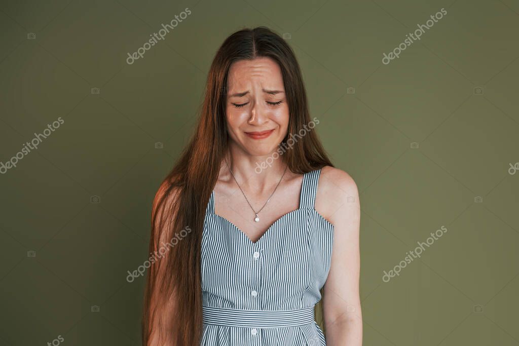 Young woman in casual clothes is crying while standing indoors in the studio.