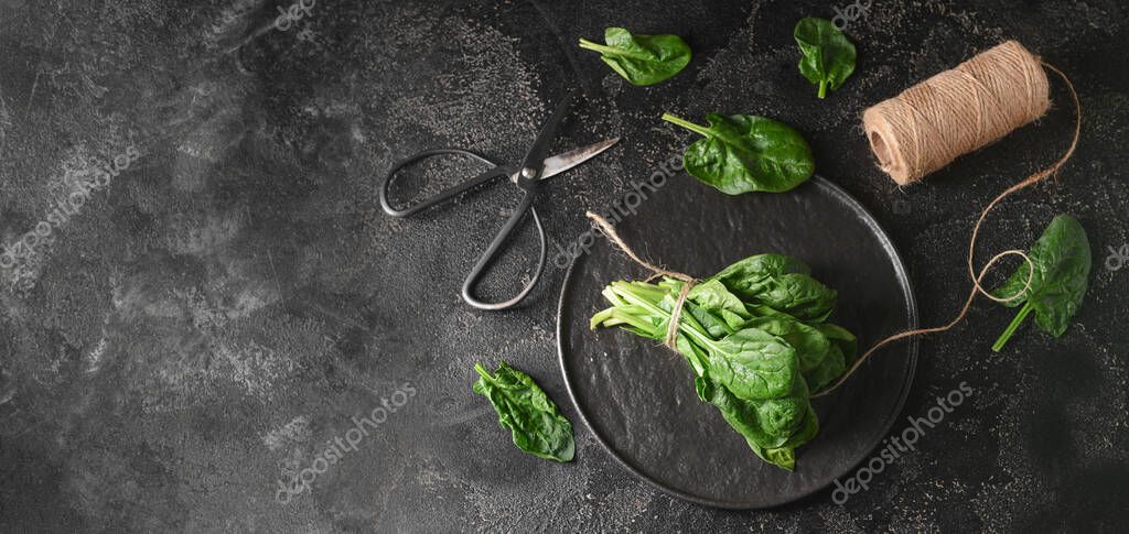 - Plate with fresh spinach leaves, scissors and thread on dark background with space for text