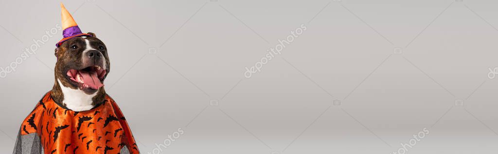 purebred staffordshire bull terrier in halloween cloak and pointed hat isolated on grey, banner