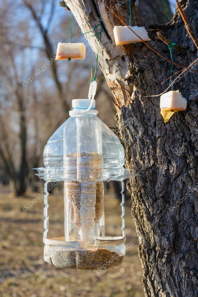 Big plastic bottle used as feeder for birds in winter