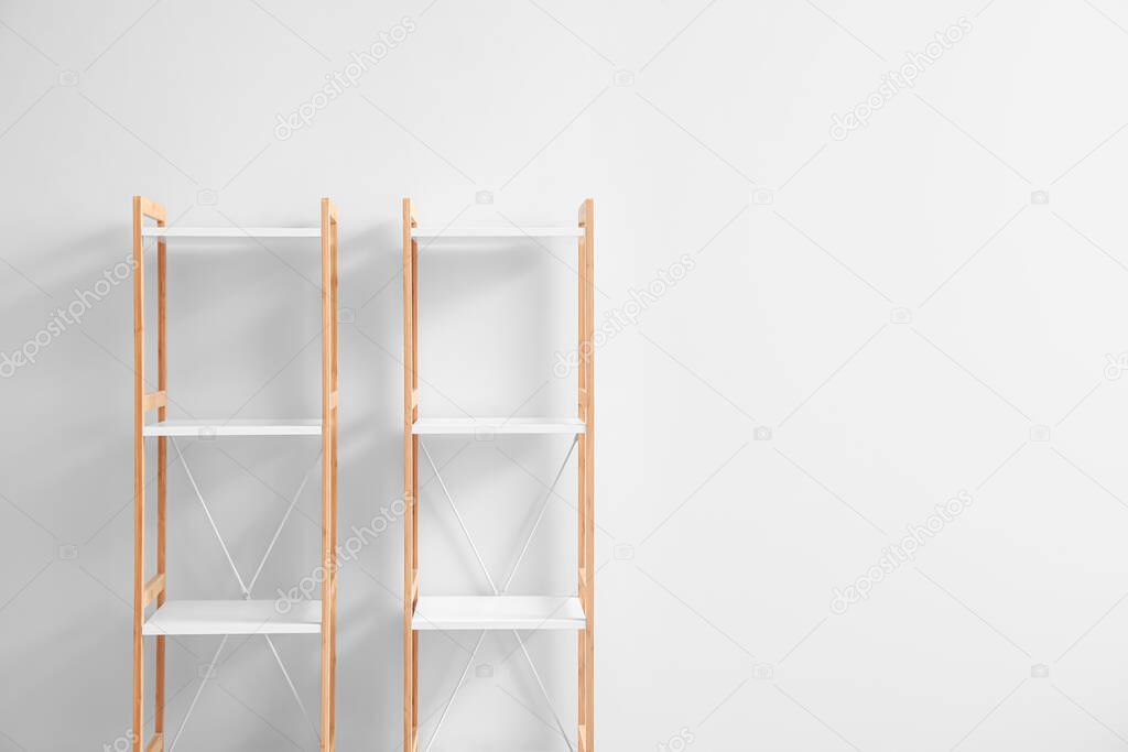 Empty shelving units near light wall