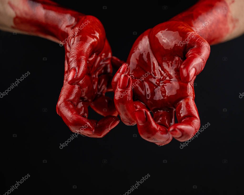 - Womens hands in blood on a black background