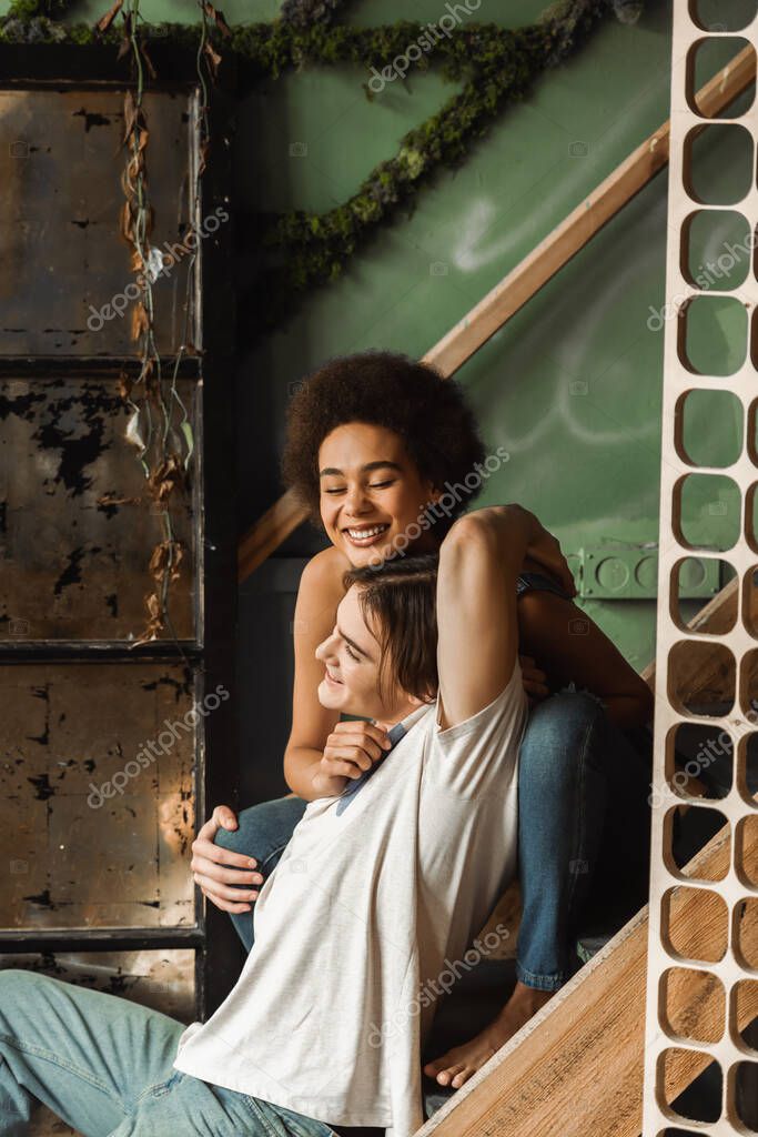 - cheerful african american woman with closed eyes embracing with happy man while sitting on stairs in art workshop