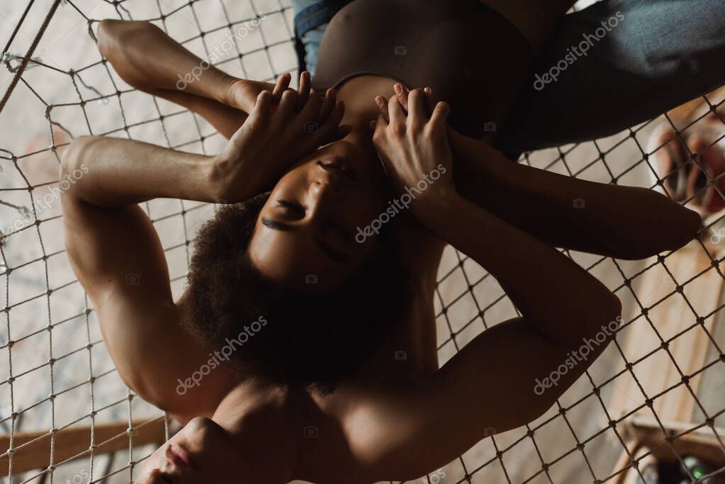 Top view of passionate interracial couple holding hands while lying in hammock in workshop
