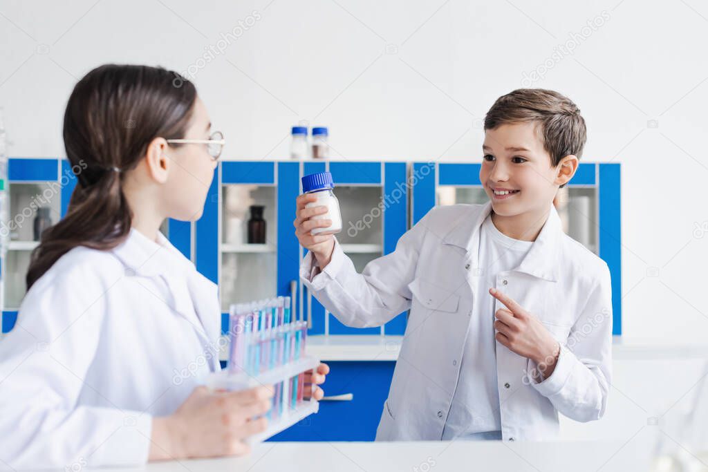 Happy boy pointing at jar with white substance near blurred girl with test tubes