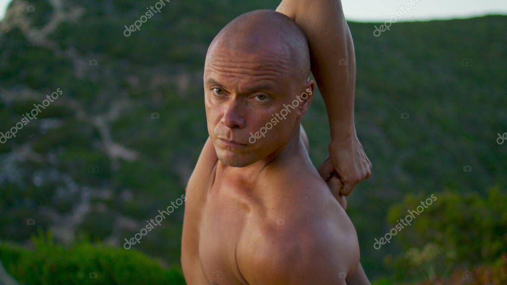 GREEN BEAUTIFUL CLOSEUP SUMMER SERENE MORNING PORTRAIT WELLBEING MAN MOUNTAIN MEDITATION EVENING STRONG ACTIVE LIFESTYLE BALANCE FIT FITNESS EXERCISE SPORTSMAN MOOD GUY ATHLETE HANDSOME RELAXING DOING BOLD TRAINING FOCUSED ARMS YOGA STRETCHING SPIRITUAL MUSCULAR WORKOUT ASANA PRACTICING YOGI TRANQUIL SCENE CLOSE UP LEISURE TIME ZEN LIKE SLOW MOTION STRESS FREE ATHLETIC MALE HAND LOCK MINDFULNESS CONCEPT HEALTHY WELLBEING