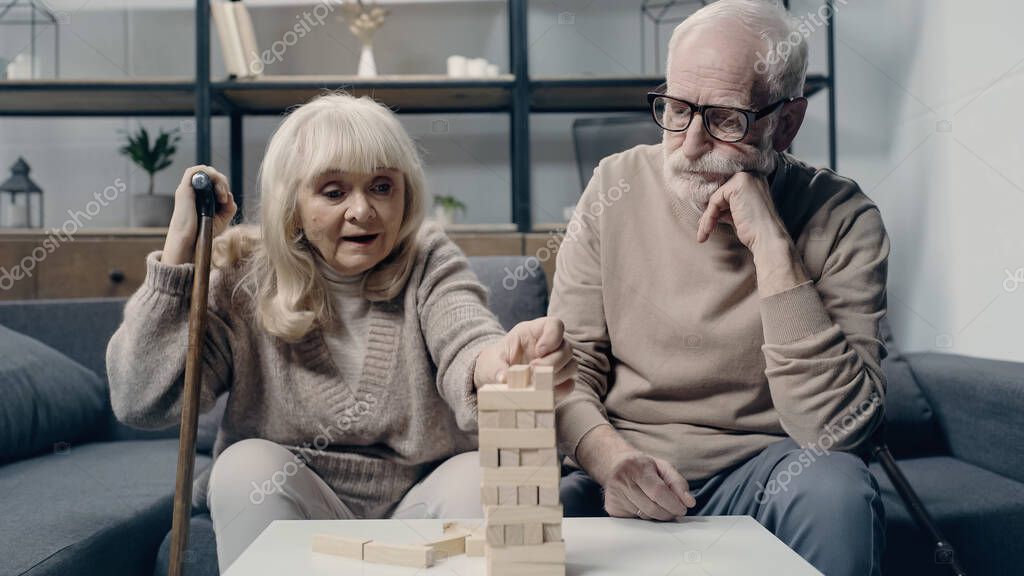 senior woman with walking cane playing in blocks wood game near bearded husband