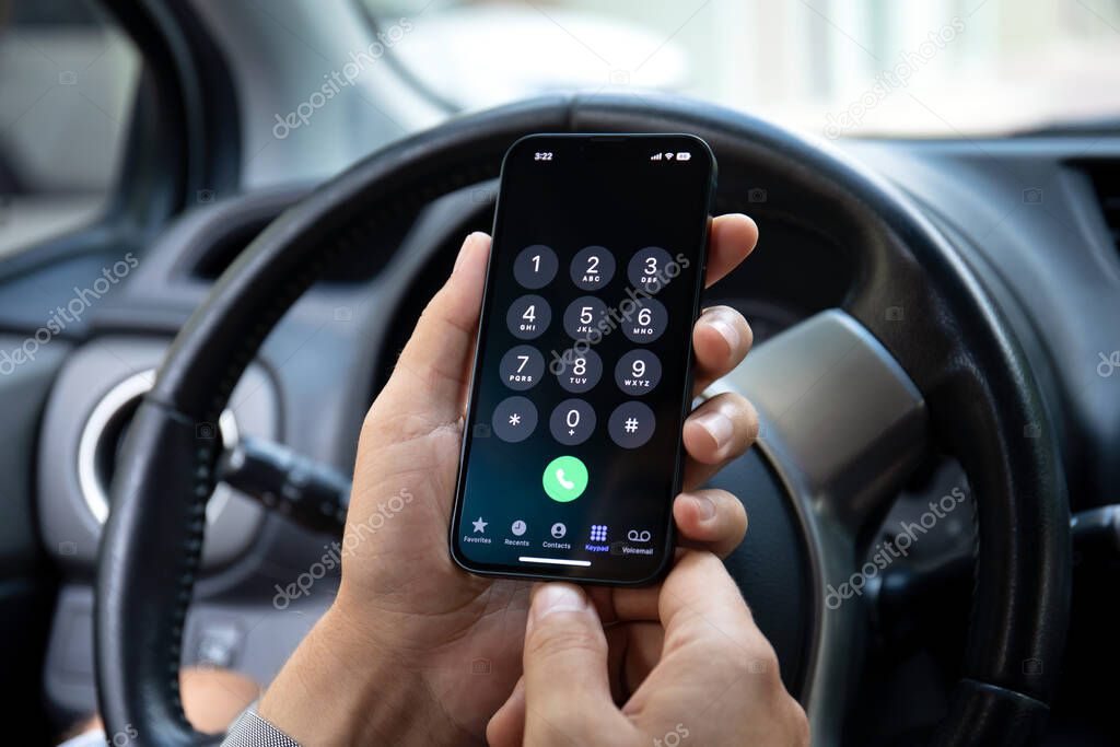 - Alanya, Turkey - September 22, 2022: Man hand holding iPhone 14 with call phone on the screen IOS 16 in the Toyota car