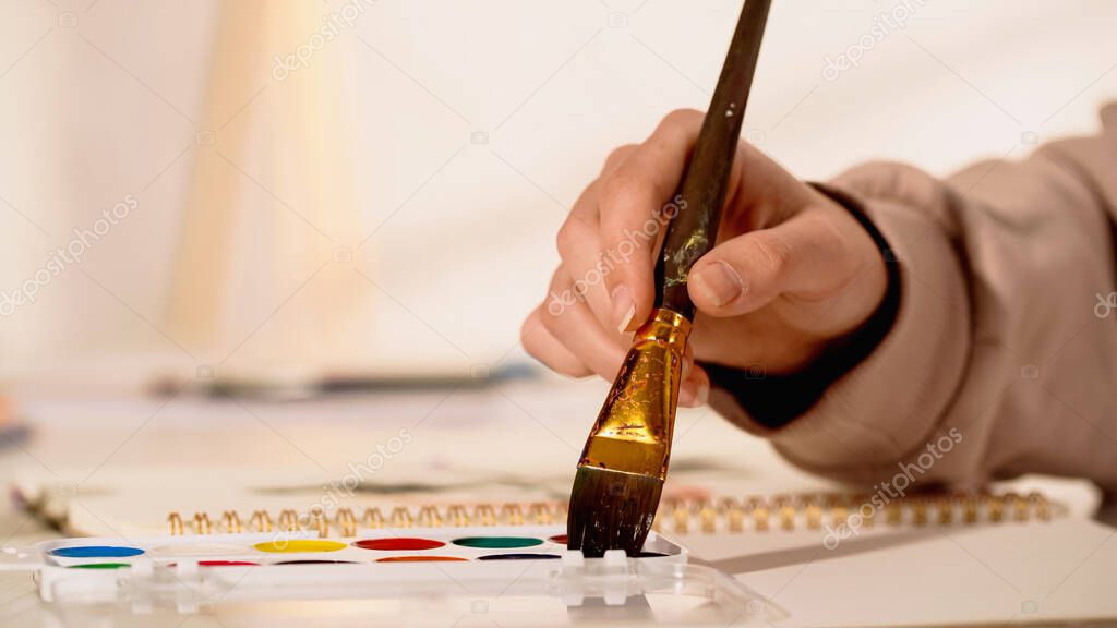 - Cropped view of woman holding paintbrush near watercolor paint at home