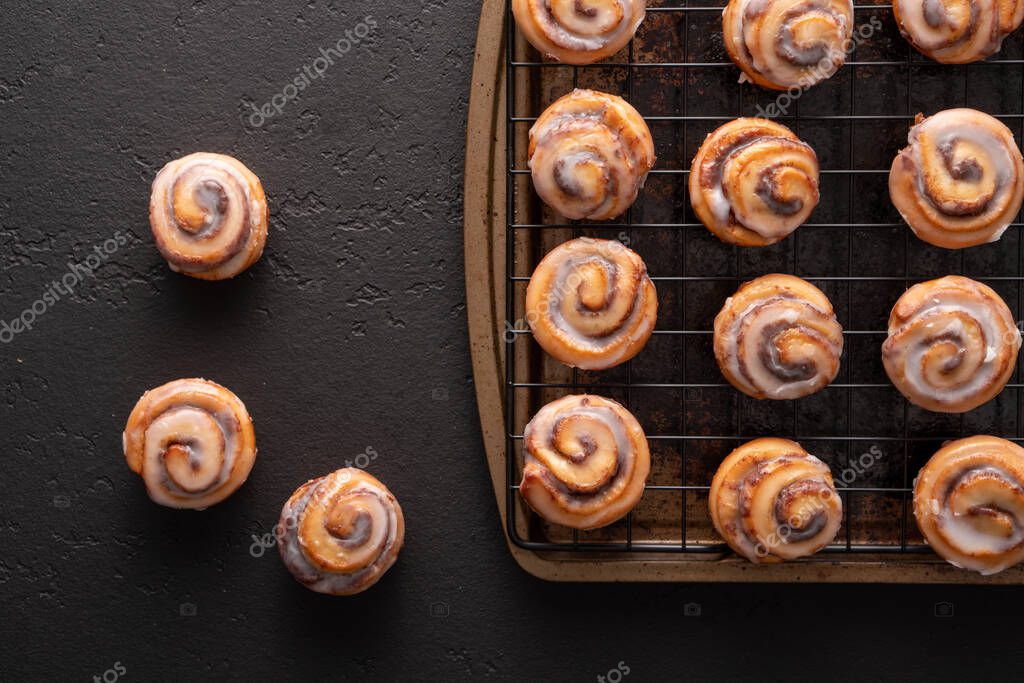 - Homemade baked cinnamon rolls baked in a cookie sheet with icing.