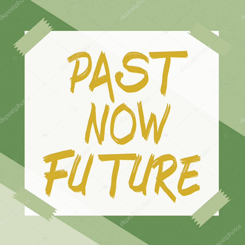 Sign displaying Past Now Future, Business overview Last time Present Following actions Destiny Memories