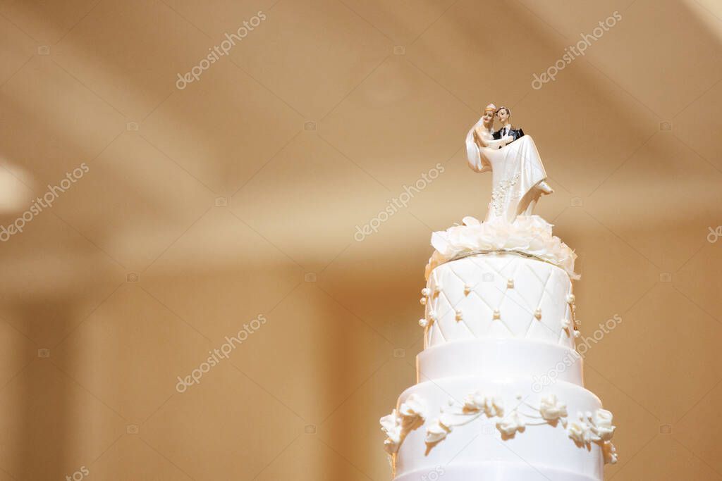 - wedding cake with bride and groom dolls on top with blank copyspace
