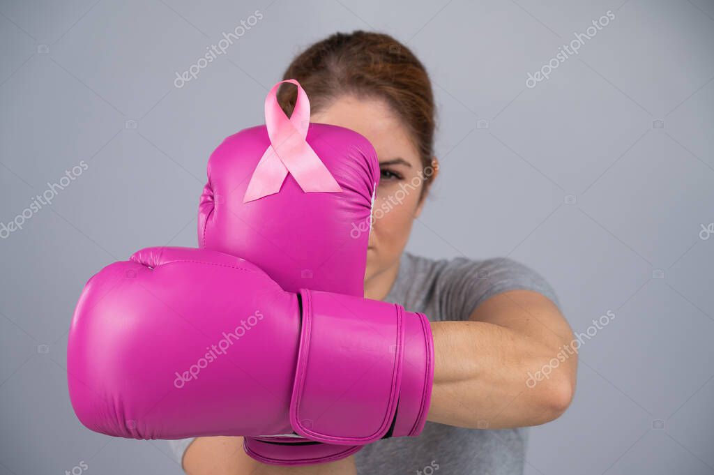 Caucasian woman in pink boxing gloves with a pink ribbon on her chest on a gray background. Fight against breast cancer