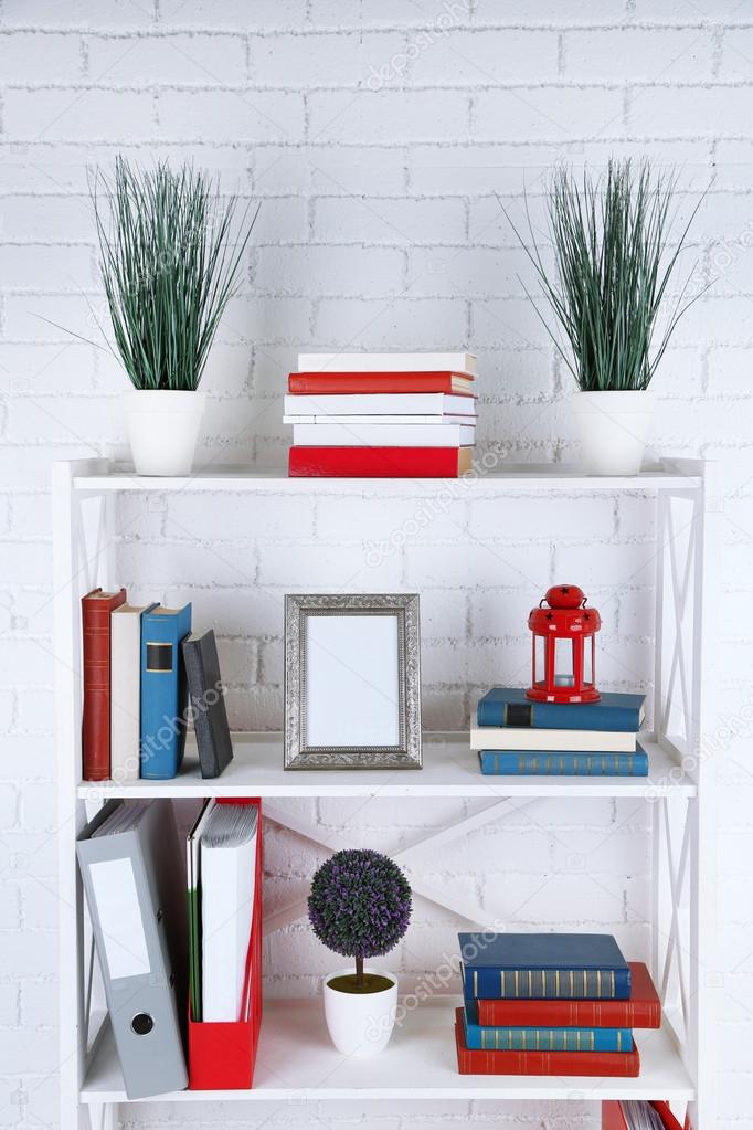 - Bookshelves with books and decorative objects on brick wall background