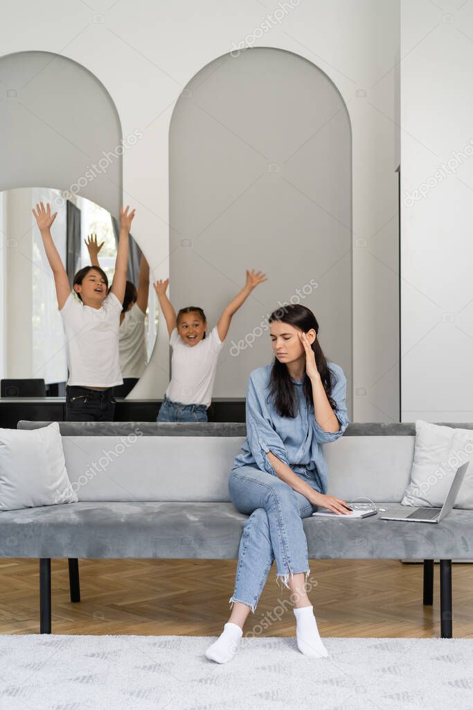Tired woman sitting near laptop and cheerful asian kids at home