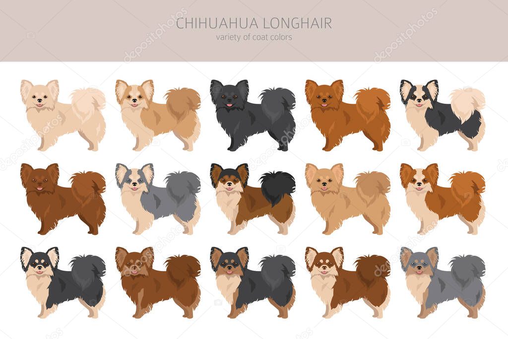 - Chihuahua long haired clipart. All coat colors set. Different position. All dog breeds characteristics infographic. Vector illustration