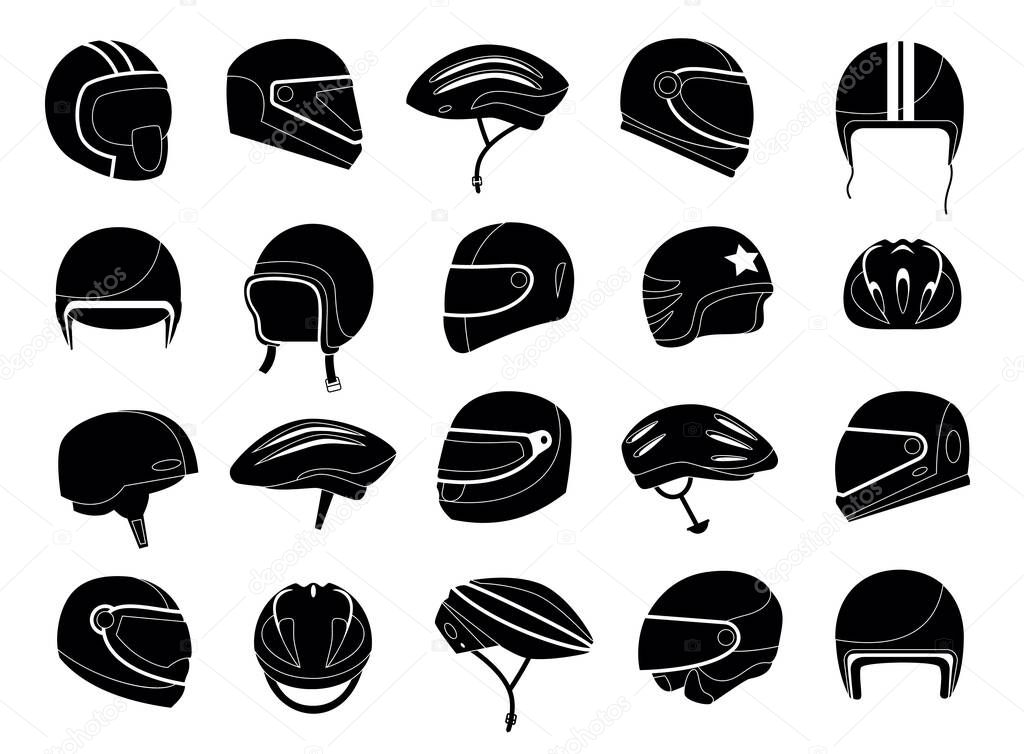 - Motorcycle helmets silhouette. Monochrome racing headgear equipment for car motorbike bicycle driver, head protection for ride. Vector set of motorcycle helmets silhouette for sport illustration