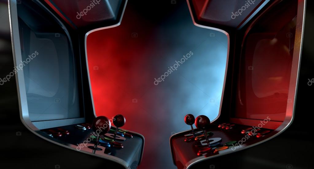 Two vintage unbranded arcade games with a joysticks and buttons and a blank screen opposing each other lit by contrasting colour schemes on a dark ominous background with copy space