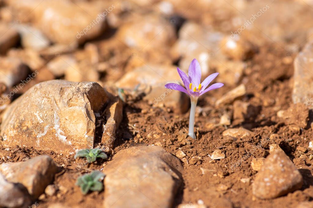 Colchicum parlatoris small wild flowering autumnal flowers endemic on Zakynthos Greece island, purple pink flowering plant in brown dirt