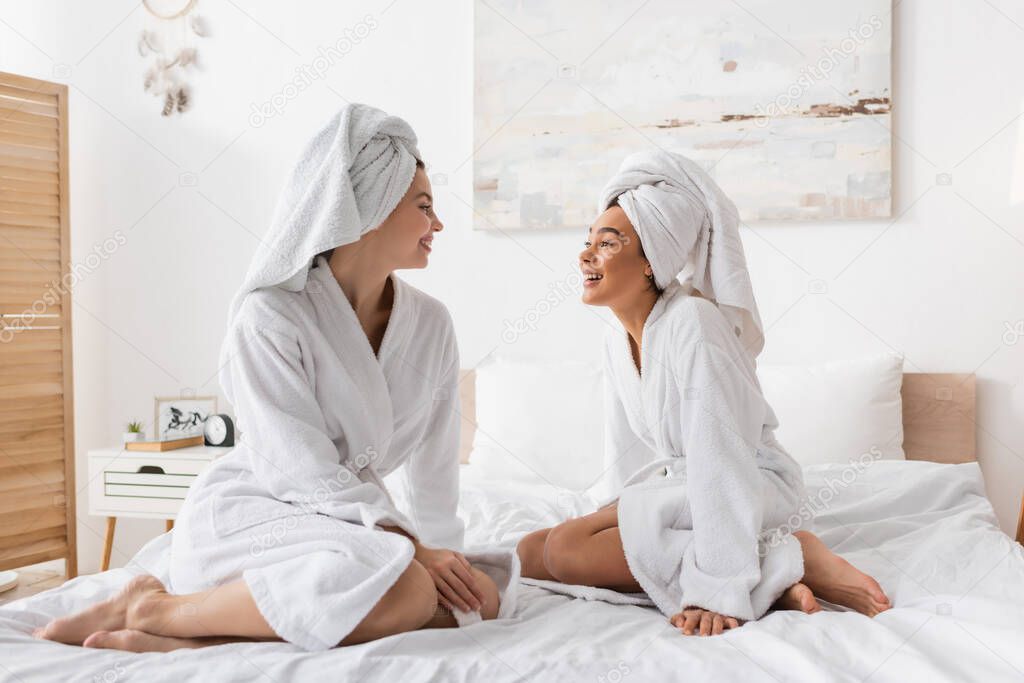 Full length of barefoot interracial women in white robes and towels sitting on bed and smiling at each other
