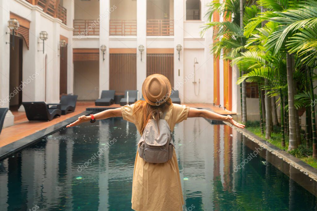 Asian woman traveller relax in resort and swimming pool in Hotel in Chiangmai, Thailand