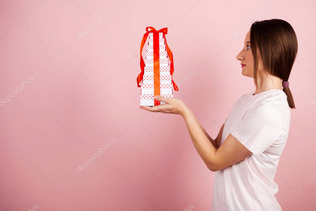 A cute brunette with a stack of beautiful gifts. A girl with gift boxes or presents and ribbons in her hands.