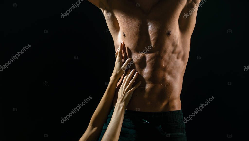 - Sexy male model with female hand. Perfect abs shoulders biceps triceps and chest. Strong man with muscular body. Sexy male bare torso. Metrosexual mans naked